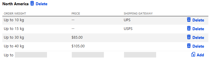 This brings up a list of the bands that are in effect for each shipping zone. You can create any number of bands for each zone to fine tune the shipping price for any weight/value. This process can be repeated for each shipping method.